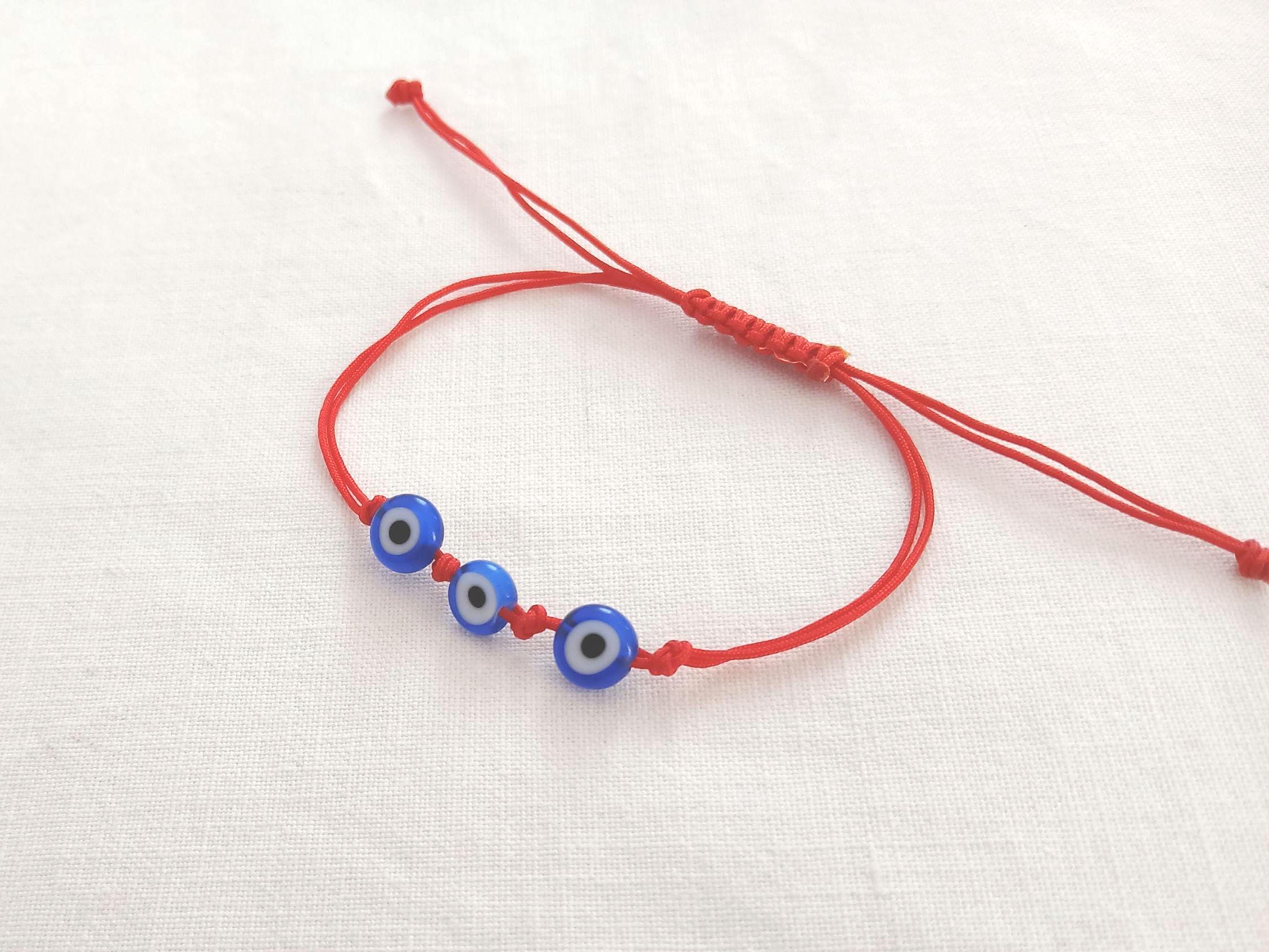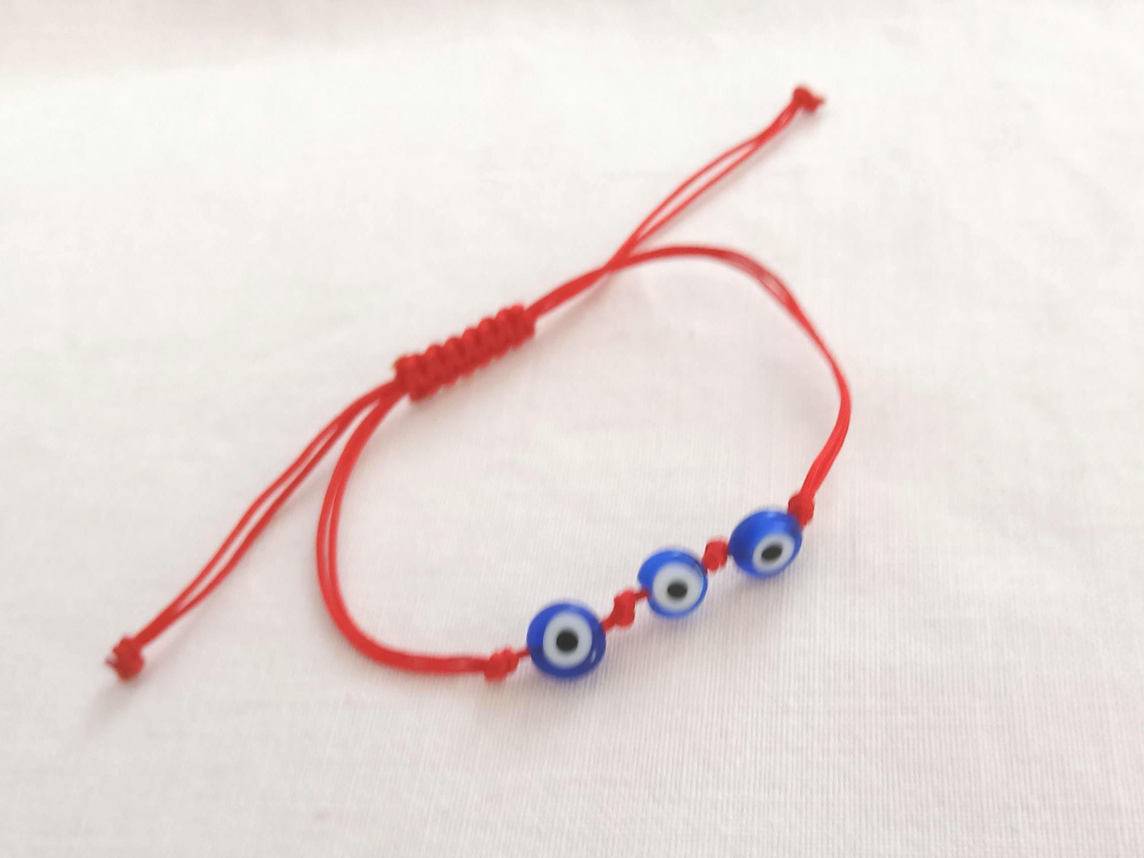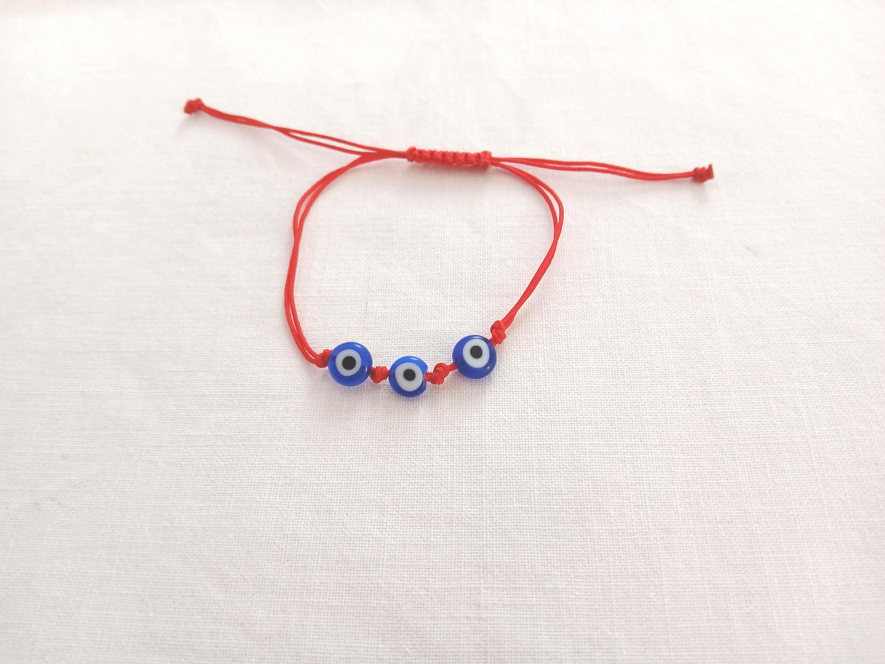 A handmade makrame with three blue evil eye beads in a red cord. Ideal gift. Adjustable.