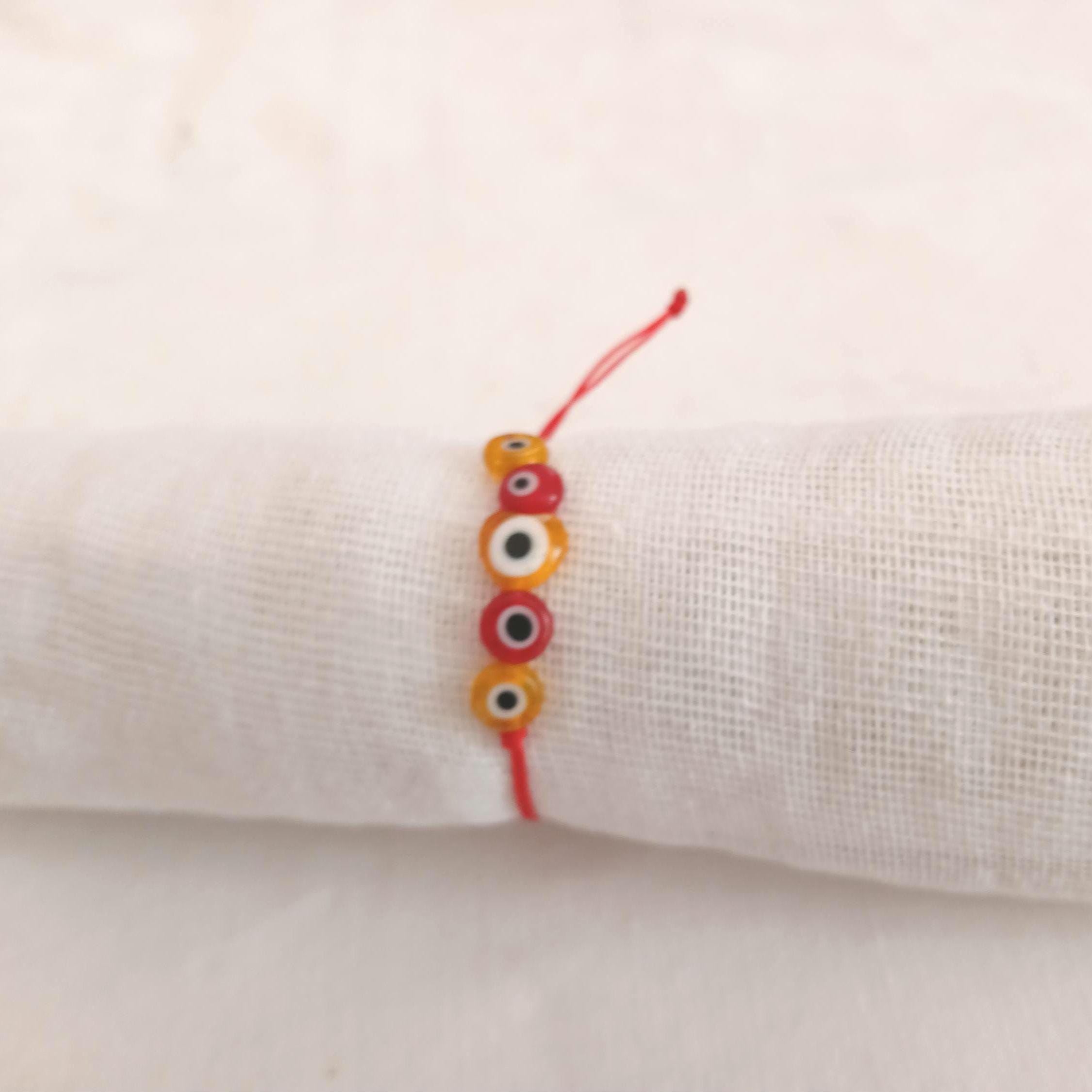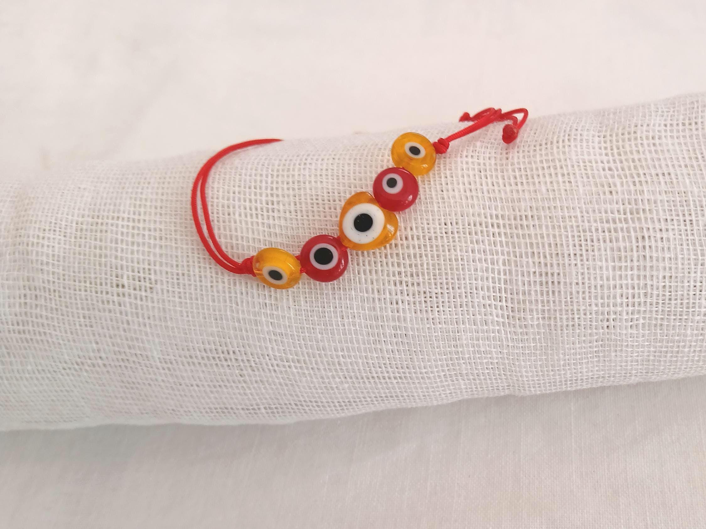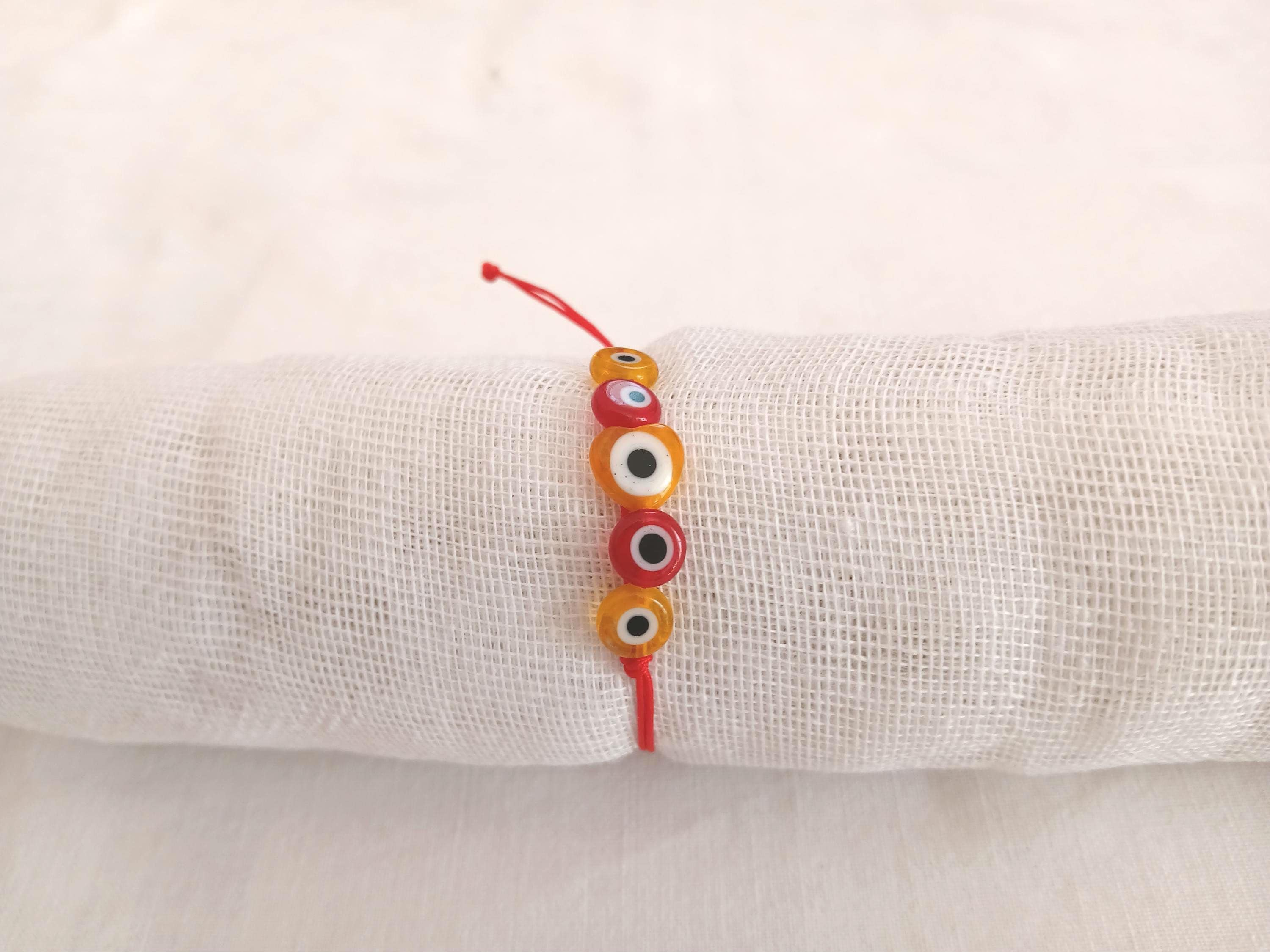 A handmade makrame bracelet with five evil eye beads. A heart shaped bead in the middle. Red and yellow evil eye beads in a red cord. Ideal for gift. Adjustable.