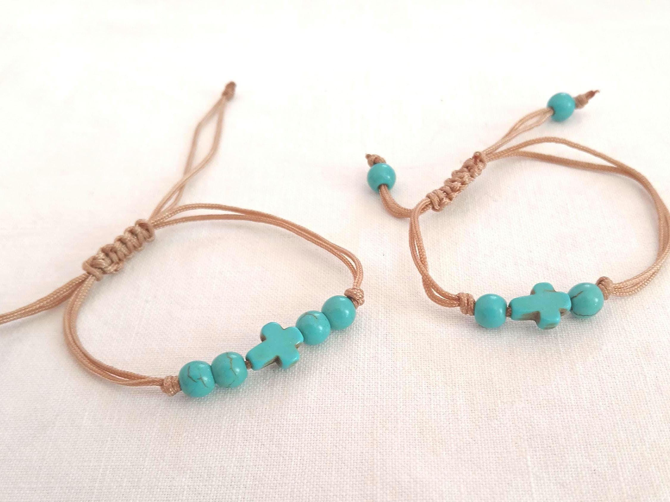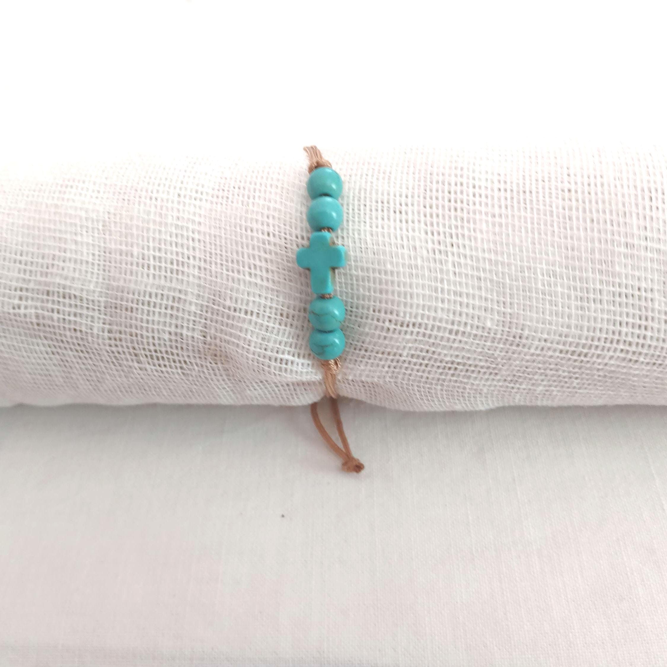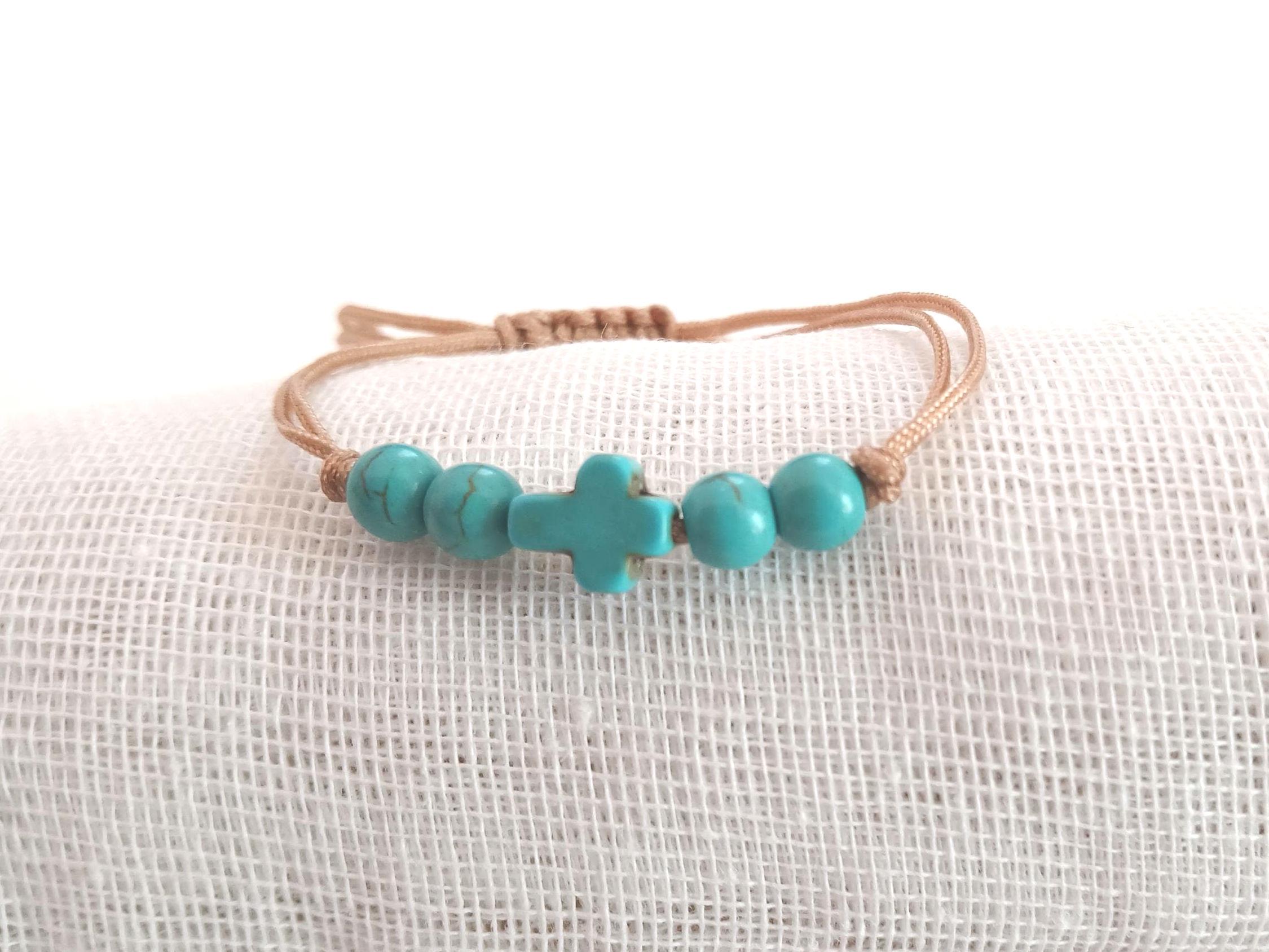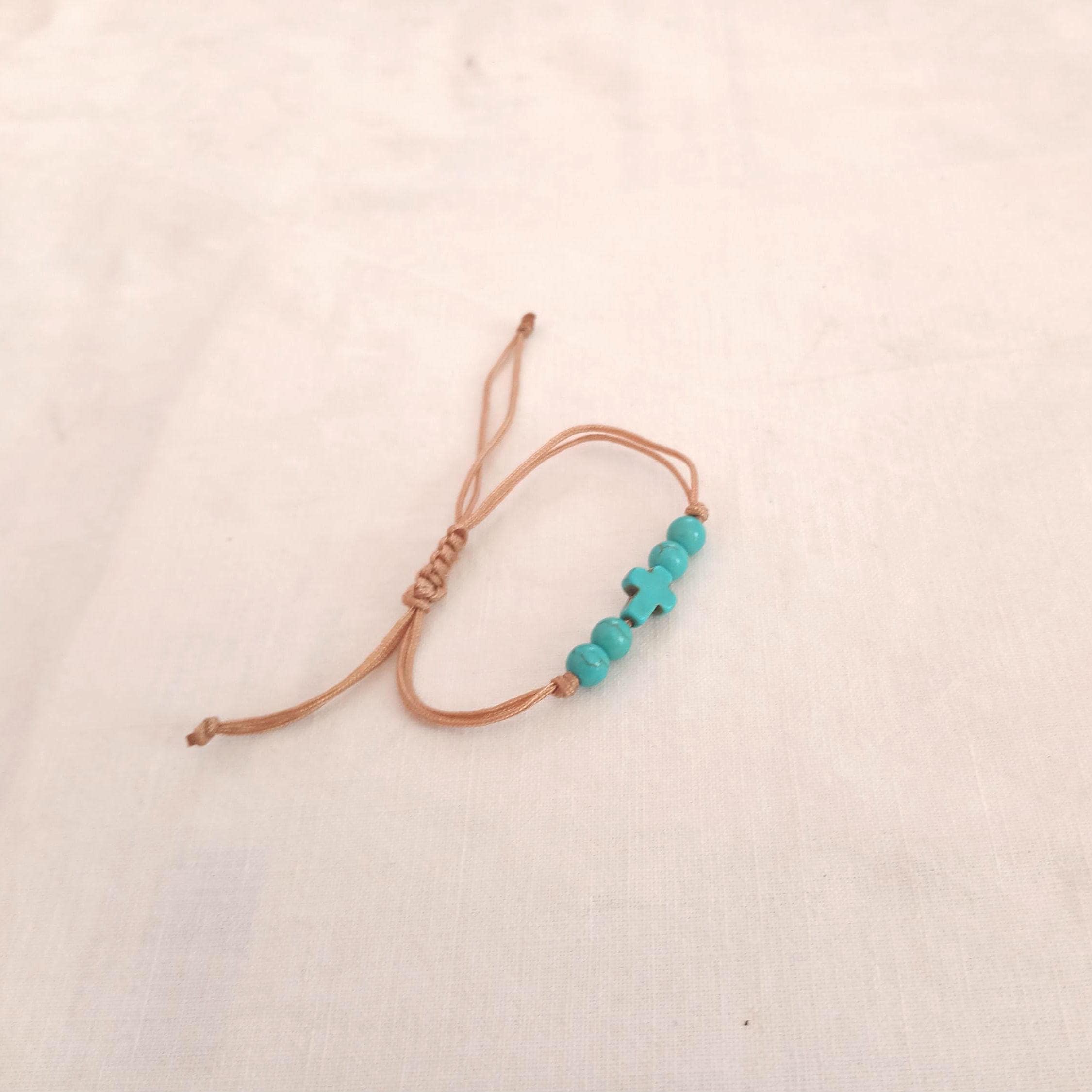 A handmade macrame bracelet. Cross petrol blue with four petrol blue beads. The cross in the middle. Ideal for gift. Adjustable.